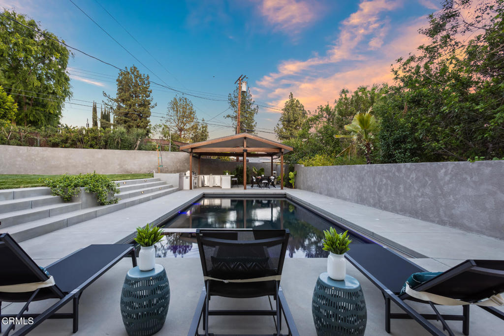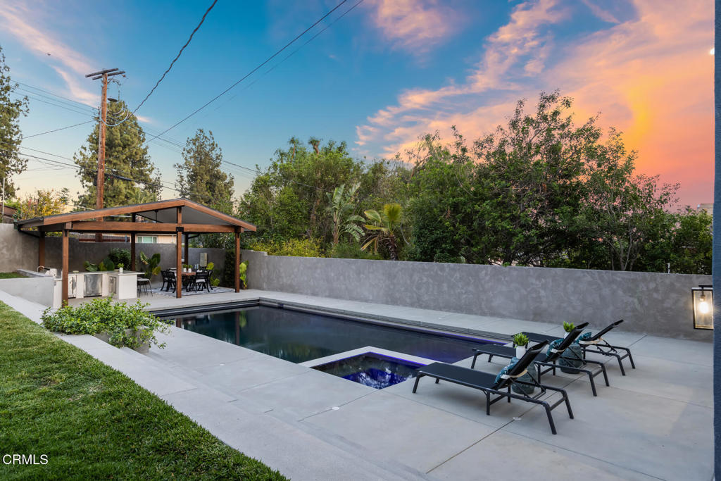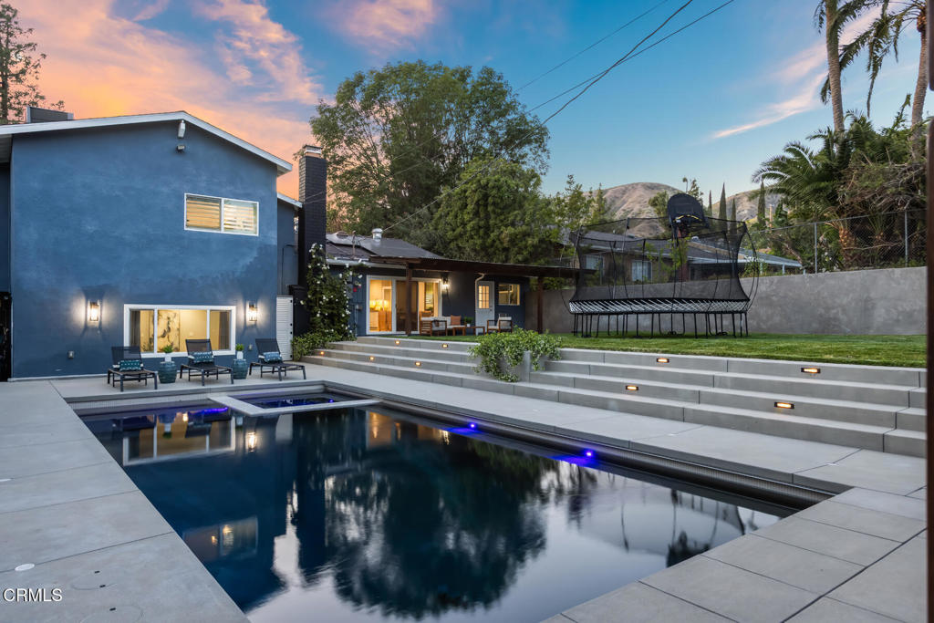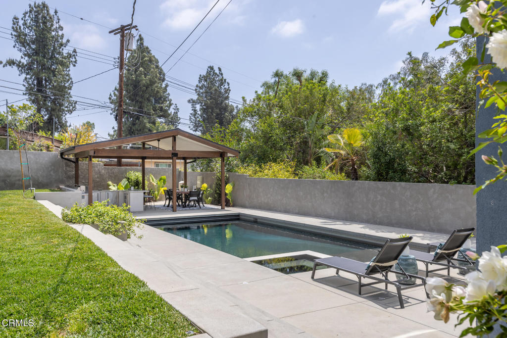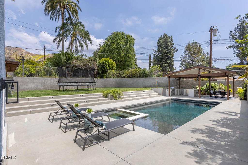 Located in the coveted Lake View Terrace neighborhood, 11442 Brainard Ave is a beautifully curated home that delivers exceptional living inside and out. Just minutes from top-rated schools, local parks, and equestrian trails, this residence seamlessly blends elegance, space, and lifestyle.Inside, the open-concept layout allows the updated kitchen, living room, and dining room to flow together while maintaining their own distinct spaces, striking the perfect balance between openness and definition. A versatile bonus room offers endless possibilities as a home office, gym, or creative studio, while the downstairs family room provides a cozy retreat, ideal for movie nights or relaxed gatherings.Step outside to a private, resort-style backyard featuring a sparkling Pebble Tec pool with color-changing lighting, a large Baja shelf, a spa, and an automatic cover for added convenience and safety. An expansive covered cabana with a built-in outdoor kitchen and grill creates an ideal space for entertaining, surrounded by lush landscaping, a spacious grassy backyard, and a fenced front yard for additional outdoor enjoyment.All three bedrooms are thoughtfully situated on one wing of the home, offering updated finishes and ample storage. The primary suite is a true highlight, featuring a spacious sitting area, walk-in closet, and a spa-inspired bathroom with double vanities, an oversized shower, and a built-in sauna.Bougainvillea flowers gracefully arch over the two-car garage, which is equipped with a Tesla charger and rooftop solar panels for enhanced sustainability.This is more than just a home, it's a bold expression of design, innovation, and California living in one of Sylmar's most sought-after pockets.